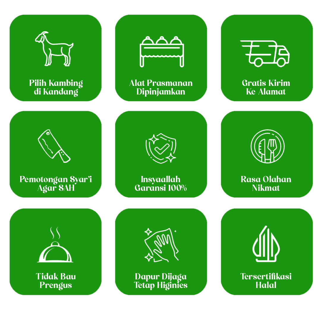 Diolah oleh koki berpengalaman menjadikan daging kambing tidak bau prengus dan cita rasa rempah yang kuat dan nikmat serta dikemas dengan berbagai pilihan paket aqiqah